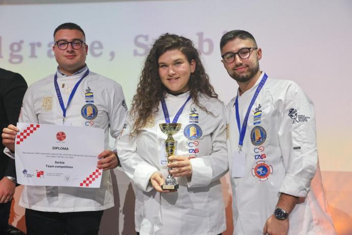 Među njima je bio i jako uspješan tim iz Srbije pa je chef Glavica iskoristio ovaj trenutak kuharskog zajedništva i uručio trofej mladom timu - Mateji Taubner, Đuri Tintoru i Timotiju Saviću, koji su se na Croatian Culinary Cupu natjecali timski i osvojili broncu.