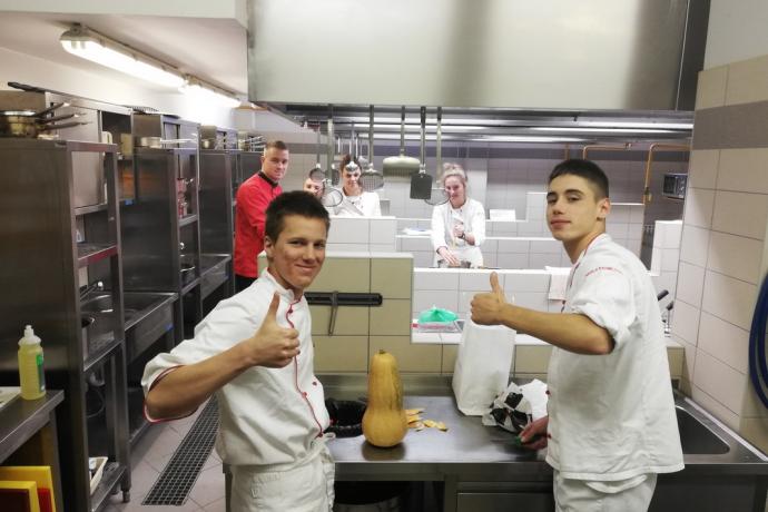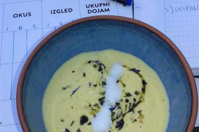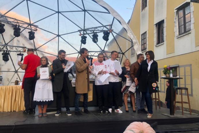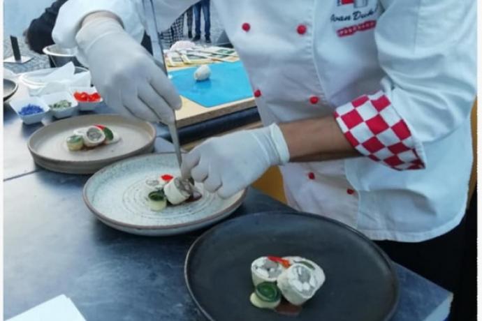 Članovi tima Udruge kuhara i slastičara Osječko baranjske županije za predjelo su pripremili juhu od buče i đumbira iz sifona s ljuskicama krumpira te pestom od bučinih sjemenki i pjenicom od mlijeka, dok su za glavno jelo pripremili slavonski mozaik, spoj crne svinje i piletine prošarane prahom začinskog bilja pripremljeno sous vide kremom od celera i oraha, ratatuiem od tikvica te mesnim jusom. Za desert su poslužili slavonske fagotine (taškice) s pekmezom od šljiva, crumblom od panka i oreo praha te aromatiziranim kiselim vrhnjem. Članovi ocjenjivačkog tima, dr. sc. Darja Sokolić dipl. Ing. preh. teh, mr. sc. Lidija Maurović i nastavnik kuharstva Ivan Gašpić, u konačnici su članovima tima moderne kuhinje dodijelili veći broj bodova čime je isti zasluženo odnio pobjedu.