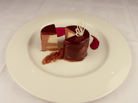 S parfeom od smokve i badema obložen mousse od bijele čokolade s coulisom od prošeka i jagode