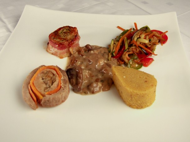Dio mesa narežemo za roladu, a ostatak sameljemo, dodamo jaja, vrhnje i crvenu papriku, zamotamo roladu i začinimo , obložimo panecetom i pečemo u kalupu. Ispečenu roladu narežemo i serviramo.