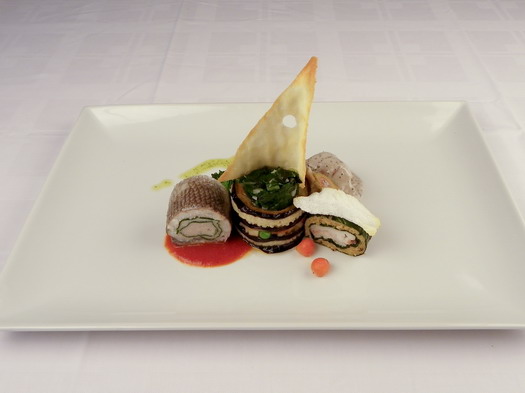 Prosenu kašu pržimo na maslinovom ulju sa češnjakom, zalijemo ribljim temeljcem i na kraju dodamo pržene sjemenke suncokreta, sezama i parmezan. Korjenasto povrće narežemo na sitne kockice i kratko sotiramo na maslinovom ulju. Patliđan režemo na kolutove i kratko popržimo. Naizmjenično slažemo sloj sotiranog povrća, patliđana i prosene kaše. Jelo garnirati kuhanom mrkvom, brokulom, maslinama punjenim ribljom farsom i crnom ikrom u tempuri, jedrima od parmezana.