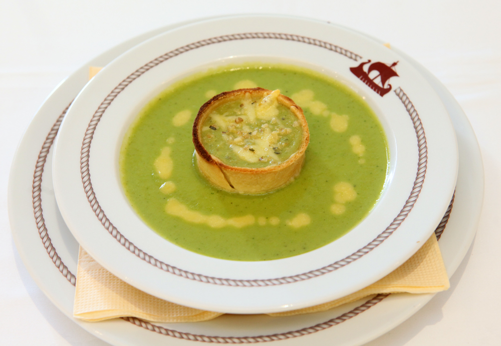 Grašak samljeti zajedno sa ostalim kuhanim povrćem, začiniti i podijeliti na dva dijela. Jedan dio legirati s vrhnjem, a u drugi dodati sjemenke i orah. Od brašna, vode i maslaca napraviti prhko tijesto, oblikovati ga u košaricu i zapeći. U košaricu uliti juhu sa sjemenkama, posuti Gaudom i gratinirati. Dodati ostatak juhe.