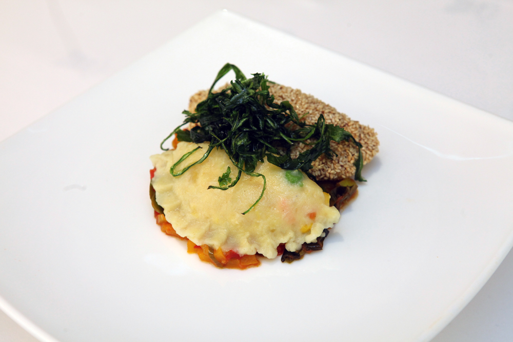 Skuhamo krumpir pa zamijesimo tijesto od brašna, krumpira, jaja, krušnih mrvica, maslaca, muškatnog oraščića i soli. Oblikujemo i punimo ga blanširanim miješanim povrćem i Gauda sirom. Uvaljamo u sezam te pržimo u dubokoj masnoći. U drugi dio krumpirovog tijesta umiješamo blanširano povrće i punimo sa svježim sirom. Kuhamo u slanoj vodi. Rikolu popržimo.